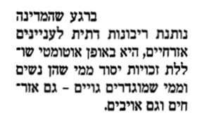 מאת כתב 'חופש' לענייני מדינה ודת