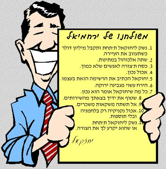 "מה פתאום?! סעיף 5 אומר: 'יחזקאל הכתיב את הרשימה הזאת בעצמו'. וחוץ מזה סעיף 2 אומר: 'צרוך אלכוהול במתינות', וסעיף 4: 'אכול נכון', וסעיף 8: 'שטוף את ידיך אחרי שהיה בשירותים'. וכולם יודעים שהדברים האלה נכונים, אז השאר נכונים גם." |