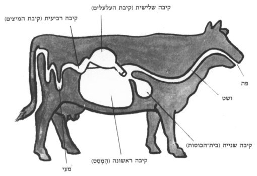 פרה הינה מעלה גרה וציור פשוט זה מראה את ארבעת קיבותיה, שבהן עובר המזון