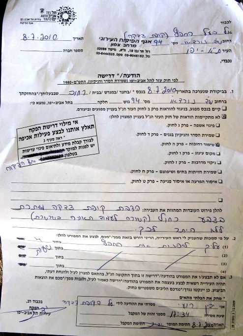 בתאריך 04.07.2010 שלח נציג 'חופש' לעיריית תל אביב את המכתב שלהלן:
