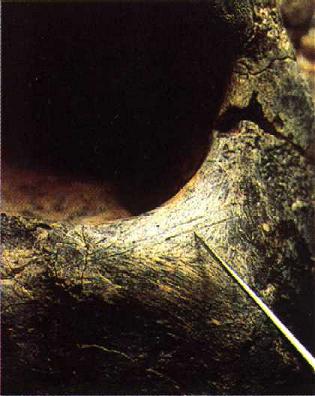 חתך של מכשיר חד, דמוי סכין, והם מעשי ידי יצורים אחרים, שכנראה קרקפו את עור