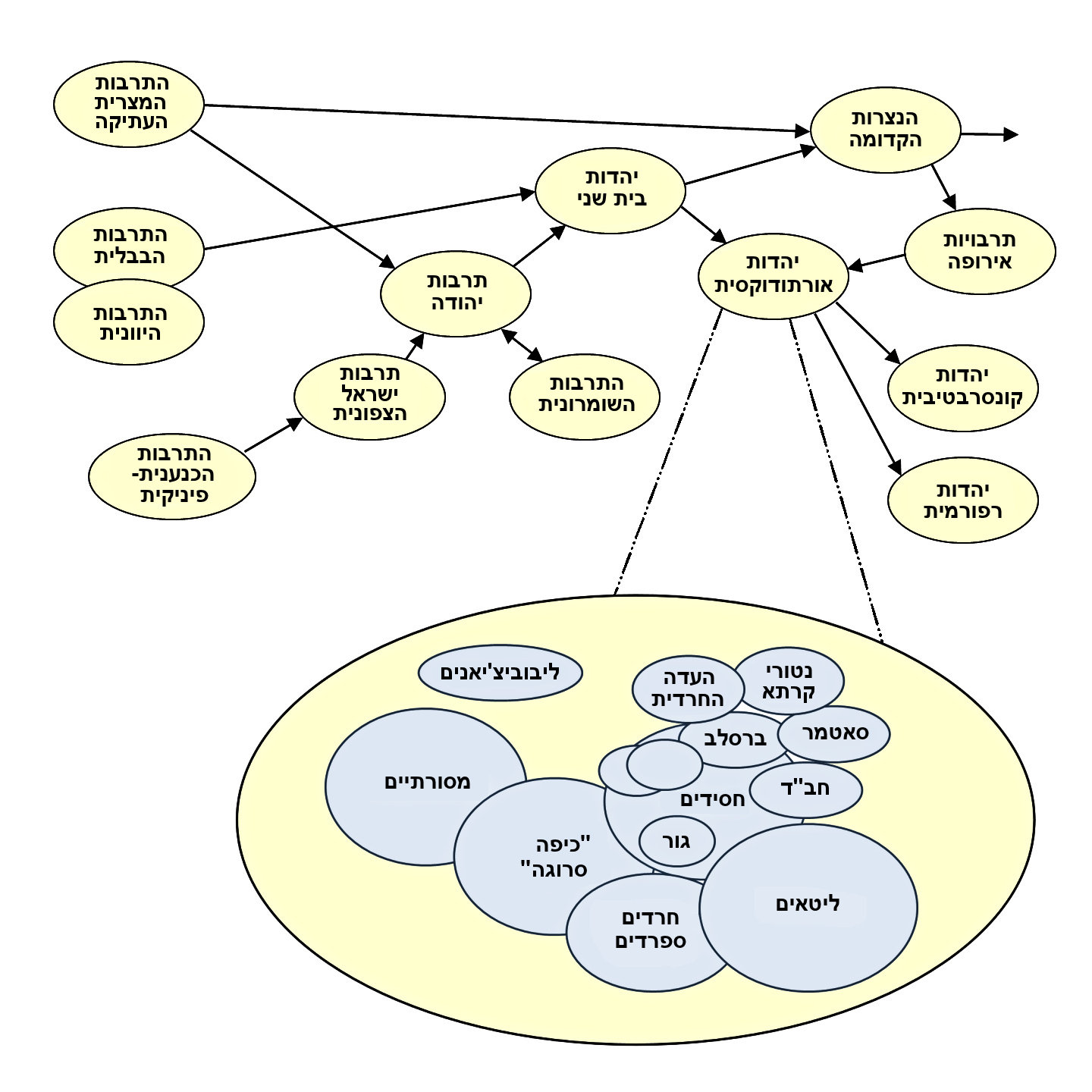 דיאגרמה חלקית של אבולוציית היהדות עשויה להיראות בערך משהו כמו השרטוט הבא, וזה רק הסיפור בפינה הקטנה שלנו של העולם: