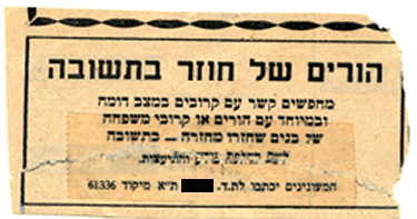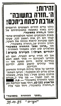 1985 הוקמה עמותה בשם "נפגעי החזרה בתשובה", שהציבה לעצמה ארבע
