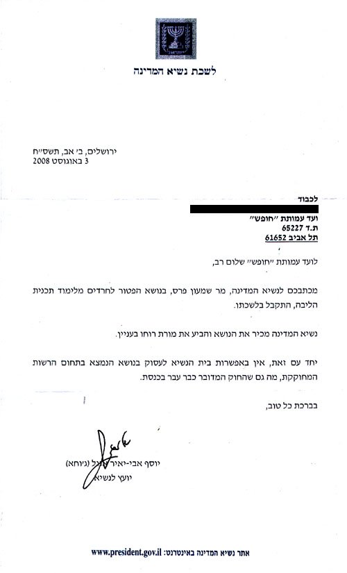בעקבות המכתב שלנו לעיל, התקבלה במערכת "חופש" תשובה מלשכת נשיא המדינה,