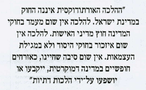 ההלכה האורתודוקסית איננה החוק במדינת ישראל. להלכה אין שום מעמד בחוקי המדינה חוץ