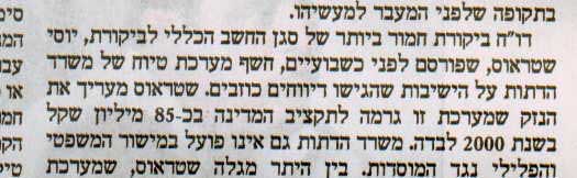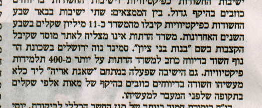 26.8.01 ידלי ,ויקלח לכ לע ךוניחב םיצצקמ .ףסכ ןיא .שדוחל שדוחמ הלוע הנידמב םילטבומה רפסמ םיכישממ דורשלו תויחל םתלוכיב םילבגומהו םיגירחה .ףסכ ןיא - םיננוחמו תונוכש - םירגסנ תוכומ םישנל תונועמ .ףסכ ןיא - םילזואו םיכלוה םימה .ףסכ ןיא - רדרדיהל רבדל רשאמ ץוח ,ףסכ ןיאו ןיאו ןיא .ףסכ ןיא .םירגסנ םיכנ םידליל תודסומ .ףסכ ןיא אלא ,הרגאינה ילפמב ומכ ךפשנ ףסכהש קר אל ןאכ !ףסכ שי ןאכ .תויתדה תובישיל :דחא :וב השענ המו ,המ םשל ,ףסכה ןתינ ימל עדוי ונניא שיא םגש ![]() ימ ררועתמ וישכע קר עודמ ?עודמ .הכ דע ביגה והשימש ילב השענ תירוביצה הפוקה דוש לככ לטונ תותדה דרשמב יארחאהשכ ,הרימשב םדרנ רצואה דרשמב יארחאה םאה ?ררועתמש ?תטלחומ תורקפה ךות ,תילמינימ תרוקיב ילב ,תחקלו הפוקל סנכיהל הככ ?הז המ ?ותלוכי תובישי שיש אלא ,וארבנ אלו ויה אלש ,תויביטקיפ תובישי הנמימ הנידמה תפוקש קר אל םישוע המ ,יארחאה ימ ,המכ ,םש דמול ימ ,תובישיה תואצמנ ןכיה תיסיפ קדב אל םג שיאש ?קודבל ילבמ םינוילימ םינתונ הככ םתס !ףסכב ![]() ףלא םירשע הזיא ,הנטק הכימת שקבי ,לשמל ,הנומידב ןוכית רפס תיבש ,תעדה לע הלעי אל והשימש ילבמ ,ריכזמה לש תופיה םייניעה ליבשב ,םתס הככ ,םתוא לבקיו ,לשמל ,לקש סנכייש ,חקפמ וחלשיי ,להנמה םע וחחושי ,םוקמב ורקבי דחי םג רצואהו ךוניחה דרשממ אלו ,תחא םעפ אלו ,ףלא םירשע אל הזו !ףסכ שקובמ ללכב המ רובע תוארל דומיל תתיכל !דבלב תחא הנשב לקש ןוילימ 85 אלא ,דחא דסומ ![]() טקל הנה .קתוש רומחה לדחמל יארחאש ימ תאז ףא לעו ,בר ןמז רבכ םיברל עודי הזה דושה :ןורחאה שדוחה ןמ אשונב תועידי לש תודושח תובישי 200" :ףשוח רצואה לש רומח ח"וד :12.8.01 ,תונורחא תועידי .םידימלת ואצמנ אל ללכ תובישי ןתוא ךותמ 17 -ב ...םינוילימב בזכ-יחווידב תקלחמב ןוגריא-הר עצבל טילחה רשה :ביגמ תותדה דרשמ :13.8.01 ,תונורחא תועידי .ודרשמב תודסומה ףגאבו תובישיה יללכה בשחה יאצמימ !לקש ןוילימ 85 - תובישיה לע חוקיפב םילשכהמ קזנה :12.8.01 ץראה םיפסכ הרזחב םיבגנ אל ;םיבזוכ םיחוויד לשב םיילילפ םידעצ םיטקננ אל :םה דרשמה לש ירוערע בור ולבקתה ;ןנכותמ תובישיה חטשב תורוקיבה תא ונקור םילהונה ;המרימב ואצוהש .דרשמה תובשח תדובעב םירומח םייוקיל ;םירוסיחה תורמל ,תובישיה םייתש :ןויליג ותואב .תובישיל תובצקה ילהונ ושבגי רצואהו תותדה ירש :13.8.01 ץראה .המרימב תודושח תובישי שמח לכמ תא םישאמ ןליא רחש .תובישיב תותיחשל תובא הברה :רמאמב ןליא רחש :14.8.01 ץראה הרטשמה האיבה ,בושו בוש תויותיחשה ופשחנ םינש רשע ךרואלש תורמלש ךכ לע ,הרטשמה ,הנידמה רקבמ אוה ןליא תנעטל ףסונ יארחא .עבש-ראבמ תחא תינויקיק התומע קר ןידל דרשמ אוה ףסונ םשא .תותדה דרשמ ביצמש יניירבעה רגתאה םע דדומתהל ךורע ונניאש םה םייזכרמ םימשא .וישכע קר ח"ודה תא םסרפ ךא תותיחשה לע ןמזמ רבכ עדיש ,רצואה .תוידרחה תוגלפמה תא םיגיהנמה םינברה תרוקיבל רימחמו שדח להונ תותדה דרשמו רצואה תלהנה ומסרפ שמא :15.8.01 ץראה .תובישיב :24.8.01 םוימ "ץראה" לש תכרעמ רמאמ ותואב הנטק הקסיפ איה לכמ תעזעזמה ![]() םיחווידב תודושחה תובישי דגנ םושיא יבתכ הכ דע ושיגה אל תוטילקרפהו הרטשמה" !רפוסי יכ ןמואי אל ."בורקב ונתשי ןהלש תויופידעה ירדסש חינהל הביס ןיאשו ,םיבזוכ בנגה לש וטפשמלו ורסאמל דיימ האיבמ ,םילקש 85 וריחמש ,לוכרמב ןוזמ רצומ לש הבינג םילקש ןוילימ 85 לש םוי רואל הבינג לבא ,ומיע ןידה לש אלמ יוצימלו ,הזבנה עשופה .הנידמב קוחה תרימש לע םידקפומה םימרוגהמ שיאל הזיזמ הנניא הנידמה תפוקמ |