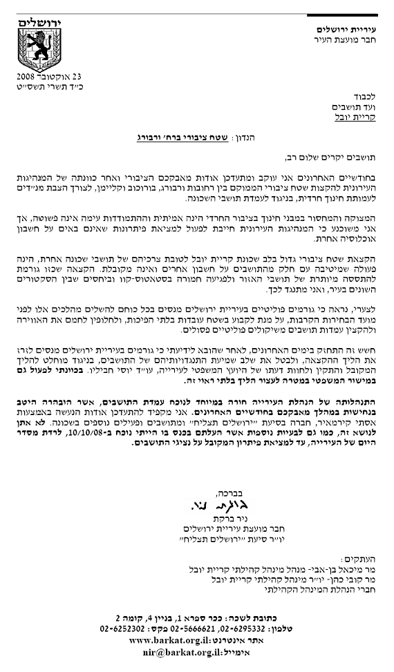 מצורפת ההודעה שהגיעה עם מכתבו של קובי כחלון, סגן ראש העיר ומחזיק תיק הבנייה בעיריית ירושלים: