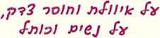 קר .תועובשה גחב לייטל קרב הלשממה שאר לש ותאירק דגנ םיחומ ס"שב :(מ) 7.6 ,יאלקח גח אוה ורוקמב תועובשה גחש ,לארשי יחרזא ראשלו שפוח יארוקל ריכזהל תיבל וב עיגהל םיווצמ לארשי ינב ויה הרותה תווצמבש ,םילגרה תשולשמ דחא םהש ומכ גחה תא םמצעל וסכינ םייתדה .רבד ותוא הז - לייטל - עיגהל .שדקמה םג ומכ ,תדל רשק אלל ,ולוכ םעה תלחנ דימת ויהו םניהש םירבד ינימ לכ םיסכנמ .דועו ,יברעמה לתוכה רודיס טלחהב הזו ,העתפה אל וז .םילשוריל ןופצמ שדח ידרח בושיי ךנחנ :(מ) 7.6 תטילק תרשאמ אל בושייה לש הלבקה תדעו :תרחא איה העתפהה .יבויחו חלצומ איה הביסה .שוקשק ."םתנומאב םיקזח קר םילבקתמ" הנעטב ,הבושתב םירזוח .טלחהב תרכומ איהו ,ןיטולחל תרחא םילשוריב תירבעה הטיסרבינואה לש םיטנדוטסה תדוגאו ישפוח םע תתומע :(ה) 8.6 םומינימ תחטבהכ תותדה דרשמ םלשמש םולשתה תא לטבל השירדב ץ"גבל ורתע .המוד הכימת םילבקמ םניא םהש םושמ ,הילפאל םינעוט םירתועה .םיללוכ יכרבאל הרוגס םילשוריב הקיתעה ריעהש וזירכה םידרחה לש תועינצה תרמשמ :(ה) 8.6 דחא בלש איה וז הזרכה ,ידרח רוקמ ירבדל ."לודגה ןוקיתה" תפוקתב םישנל םישנל םידרפנ םיליבש ןיקתהל (רוג תודיסח) ץיבונרפס ברה לש הלודג תינכתב .םינימה ינש ןיב עגמ לכ עונמל ,לתוכה תבחרב םירבגלו םייח ןבא דסומהו (םתור הוונ תשרפ - רתאב האר) לילבוב לאפר ברה :(מ) 11.6 תיב תריגסל לעופ אוה יכ ךוניחה רש תא םימישאמ צ"גבל הריתעב הנח סדרפב התרחש ,צרמ תא םדקל ןוצרו םייטילופ-םיישיא םילוקיש לשב" דסומה לש רפסה המו ,רבדמש ימ ."לארשי ידליל יתד-ידוהי ךוניח לש ןממס לכ תפידר הלגד לע תינכת" תרגסמב התשענ רפסה תיב תריגסש איה ךוניחה דרשמ תבושת .רבדמש .תשרה םע אלמ םואיתב התשענו "תשרל הארבה קוח תעצה ורשיא ,הבישיב ףתתשה אל םדבלמ שיאש ,םיידרח םיכ"ח ינש :(מ) 13.6 תונפהל שי תונעטה לכ תא .תואירב סממ תורוטפ ויהי תובישי ינב לש תוחפשמ היפל ונעמלשו םהב רחבש ,ינוליחה רוביצל םתבוח תא םיחינזמש ,םיידרח םניאש םיכ"חל !םילעופ םה םירענב הדובעה דרשמ לש תבשה תמחלמ לע ןנור השמ תאמ הבתכ :(י) 14.6 .ס'דלנודקמב תותבשב םידבועש - ונלוכ לש אוה סנקה :ס'דלנודקמ ןינעב רלסרטש הימחנ :(ץראה ףסומ) 16.6 םעפהש יואר ןכל ,תשרה לש ןוזמה ירצומל םג תשלוג ס'דלנודקמ דגנ תיתדה הייפכה .ס'דלנודקמ לע לטוהש סנקה תא וסיכמ ןממיו ןגראתי ינוליחה רוביצה ינא המל ןיבמ אל ינא :ןדפ ירמע" ?ברקל תאצוי ס'דלנודקמ :(בירעמ עובשפוס) 23.6 ,ןיבמ אל התא תעכ קר .שודק הנרוא תאמ הבתכ - "םיטיזרפ לש רוד סנרפל ךירצ םינשה לכ תייה הפיא ?ךלש הסנרפה תלבי לע ךל וכרדש ירחא קר ?ןדפ ירמוע ?זא תייה הפיא - הלועפ ףתשל תחא אל ךילא ונינפ ?תונורחאה םויכ הרוקש המ לע יול בקעי תאמ הבתכ :(תונורחא תועידי ,םימי 7 ףסומ) 16.6 :םייחה ןמ תונהיל הצור אוה םגש ,תוגורסה תופיכה ישבוח ,ימואל-יתדה רעונל - ונילא ואוב !יתד רעונ ,הפי תויחל עיגמ םכל םג ."עדתש יתיצר ,ילש םיהולא" !םכל םג חותפ ונלש בחרמה קוח" תא האילמב ריבעהלו היצילאוקה תא סיבהל לומתא וחילצה םידרחה :(מ) 20.6 תוחפשמ ולבקי יפ לע ,(הרותה תודהי) טרפלה כ"ח םזיש ,"םידלי תוכורב תוחפשמ וניגיצנ לש שיבמ לדחמ בוש .תוילכלכ תובטה לש הכורא הרוש םידלי תובורמ !תסנכב הנש ףוס תביסמ שבשל וסינ םידרח :םינוליחל םייתד ןיב תינומה הטטק :(מ) 20.6 רפסה תיב ביבס םיניינב תוגג לע םילוקמר וניקתה ,םינוליח ןוכית ידימלת לש ...אב אל חישמ לבא ."חישמ חישמ" תואירק ועימשהו יטפשמה ץעויה :(מ) .תבשב םיקסע סונקל רתיה הלבק ביבא-לת תיריע :(ה) 21.6 .תבשב םידוהי םיחקפ תקסעה ריתמ ןייטשניבור השמ עידומ ךכ ,ריעהמ ואצוי שמש תיבב ריזח תורכומה תויונח :(י) 23.6 ,22.6 דיפל ימוט .ריזח רשב רוכמל רוסא :הטילחה ריעה תצעומ .ריעה שאר ןגס ,לובטובא .ךשוחה תוחוכל ףסונ ןוחצינ :ביגמ